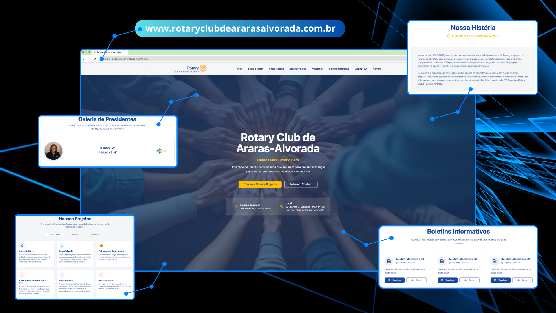 Com layout responsivo, conteúdo estruturado e identidade visual renovada, o novo site reforça o compromisso do Rotary Club de Araras-Alvorada com a transparência, a organização e o serviço à comunidade. A plataforma consolida-se como um importante canal de referência para quem deseja conhecer mais sobre o Rotary, envolver-se em projetos sociais ou estabelecer parcerias voltadas ao bem comum.